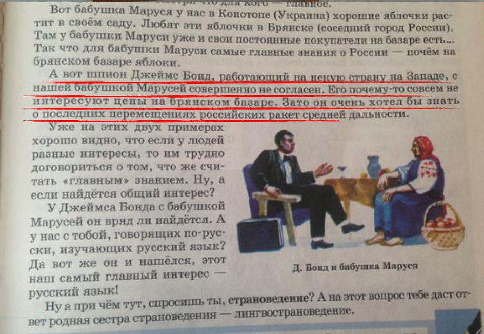 «Шпион Джеймс Бонд, работающий на некую страну на Западе, с нашей бабушкой Марусей совершенно не согласен. Его почему-то совсем не интересуют цены на брянском вокзале. Зато он очень хотел бы знать о последних перемещениях российских ракет средней дальности. А у нас с тобой есть общий интерес. Мы говорим и изучаем русский язык».